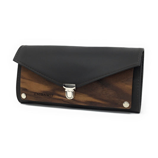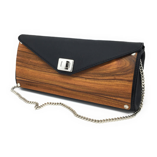 Business-Tasche aus Leder mit Holzelementen, wahlweise in der Hand oder über der Schulter zu tragen, rundet das Outfit mit einem Hauch von Luxus ab.