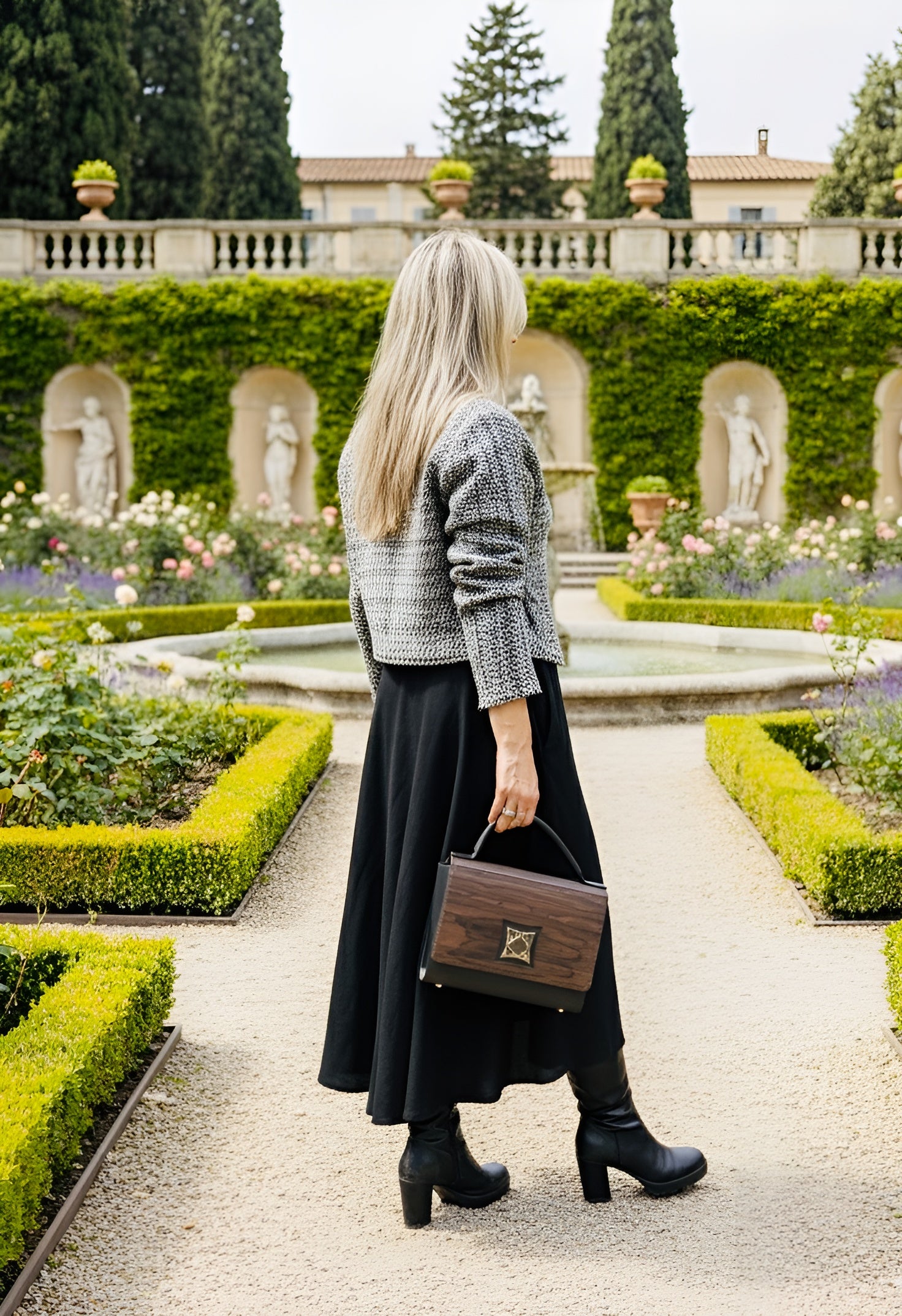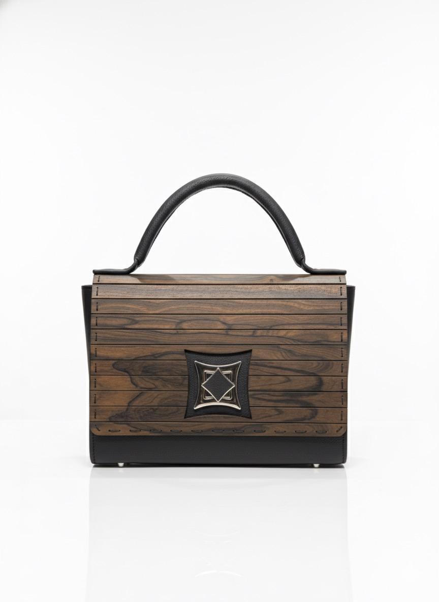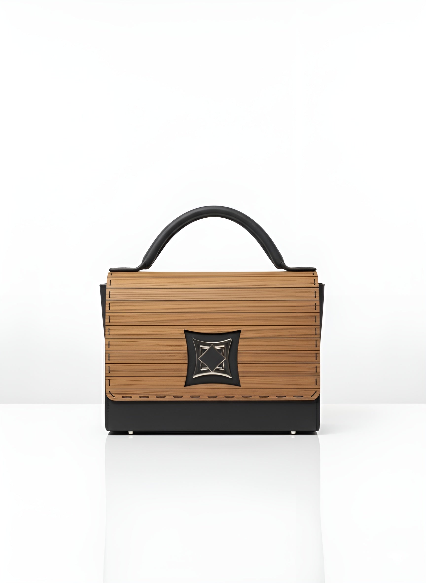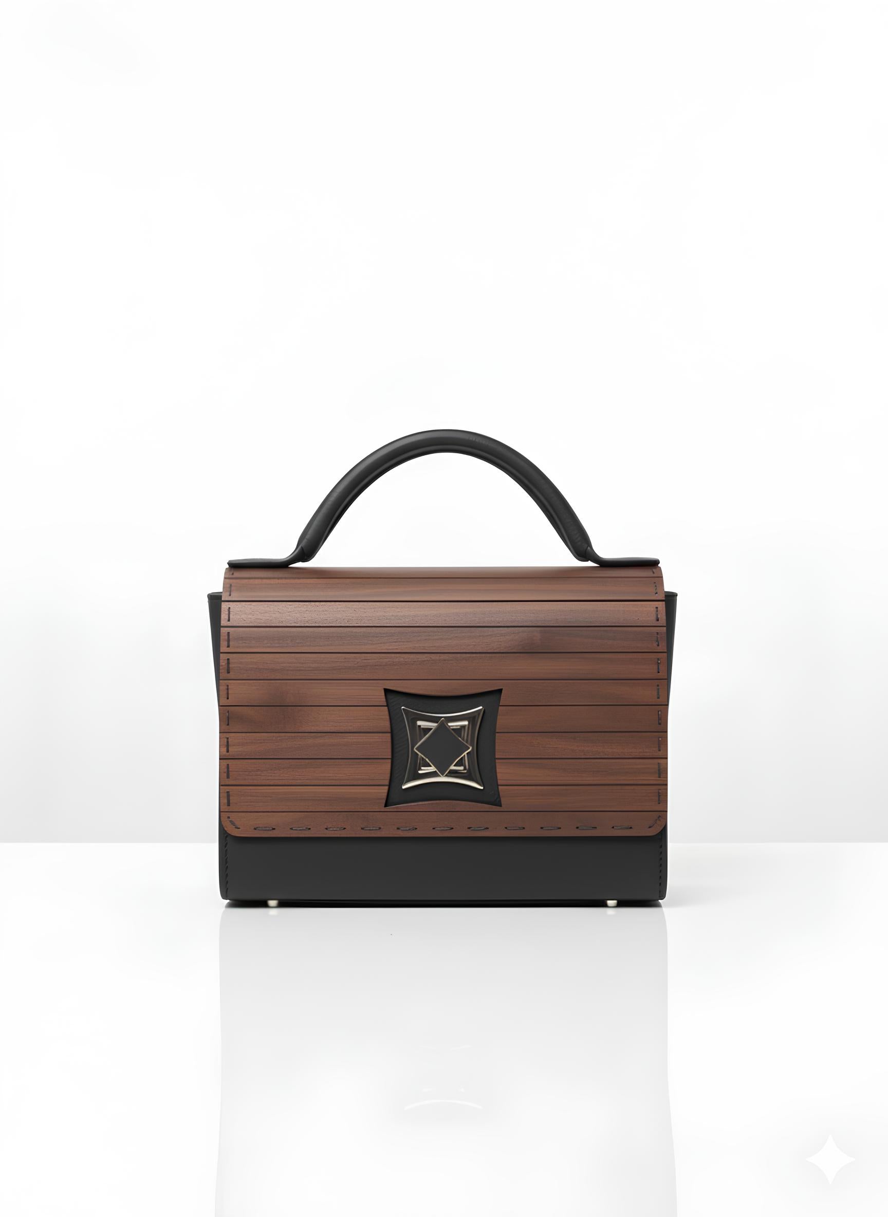 Lightweight and distinctive, the Paola bag combines a solid structure, a front panel made of wooden slats, and a striking central metal detail that makes it instantly recognizable and unforgettable.