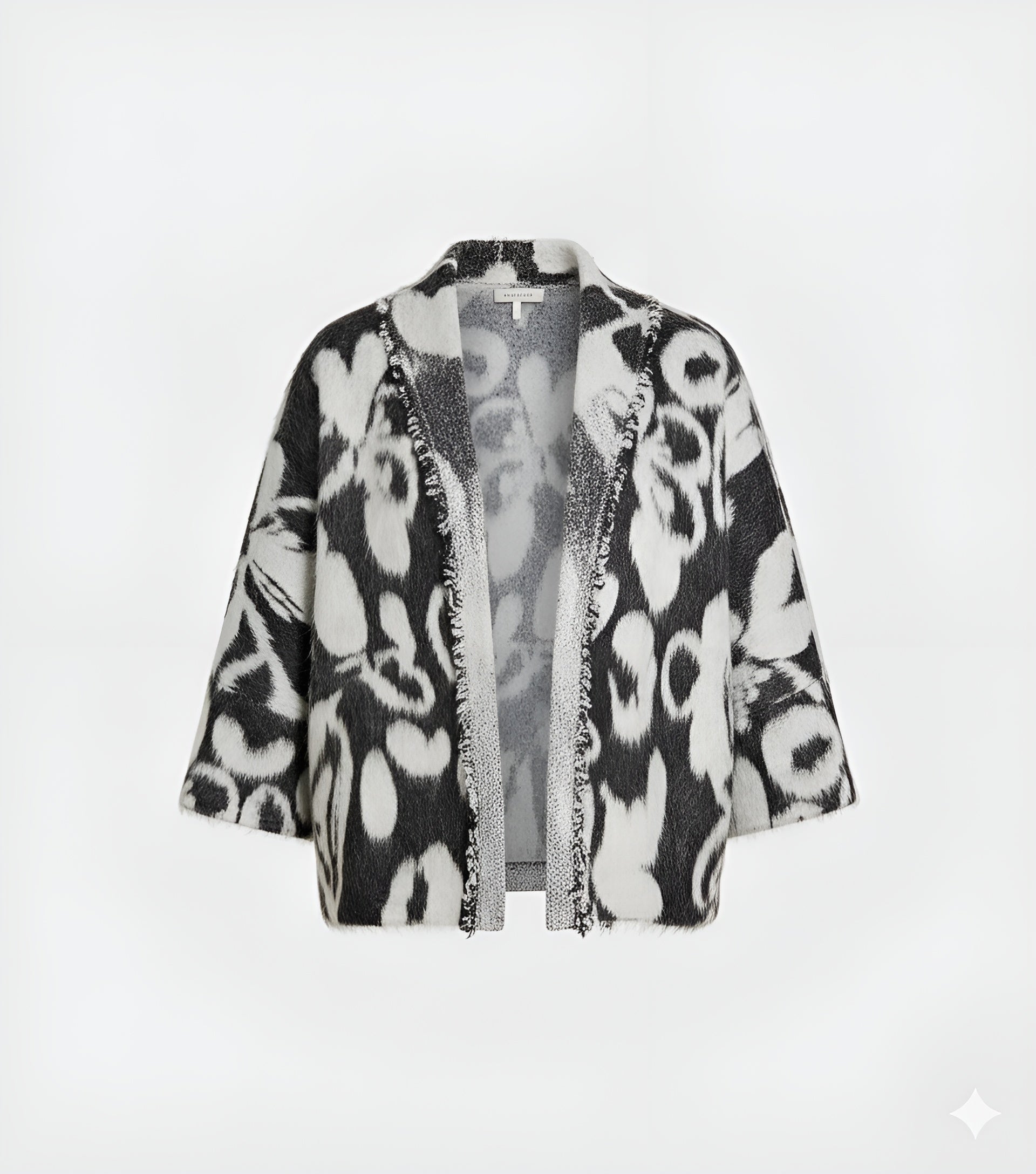 Jacke aus langflorigem Jacquardstoff mit blumenmuster in Schwarz und Weiß. Weich und anschmiegsam, mit weiter Passform und Dreiviertelärmeln, verleiht sie jedem Look eine elegante, moderne Note. Perfekt für einen casual-chic oder einen raffinierten Stil, vereint sie Komfort, Eleganz und Originalität in einem besonderen Kleidungsstück.