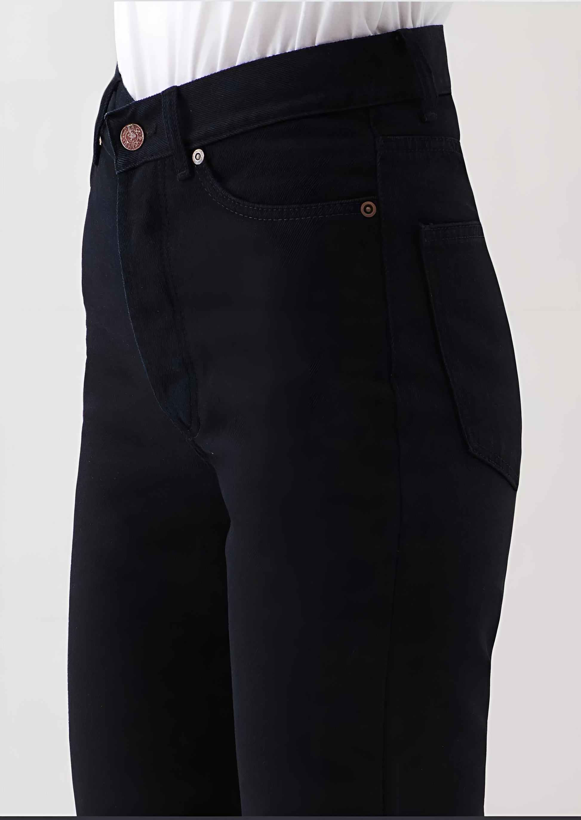 Schwarze Jeans mit geradem Schnitt und hoher Taille – ein zeitloser Klassiker, der Komfort, Eleganz und Nachhaltigkeit zu einem klaren, modernen Stil vereint.